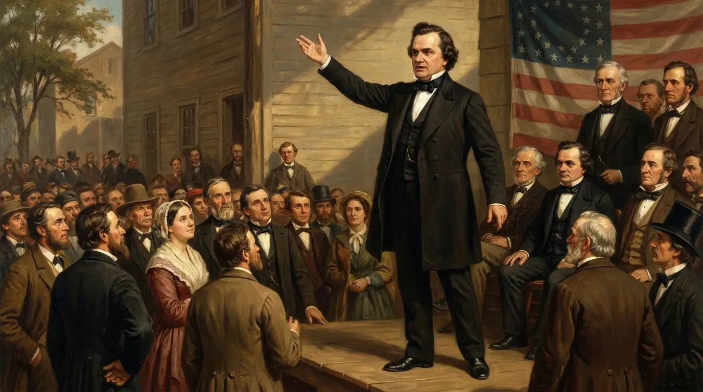 Political rally, period frock coat. "Town to town, begging the country not to break." βββββ