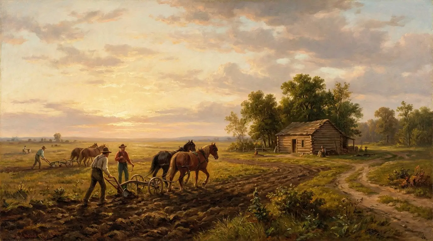 Breaking sod on open Illinois prairie. Horses, log cabin, golden light. βββββ
