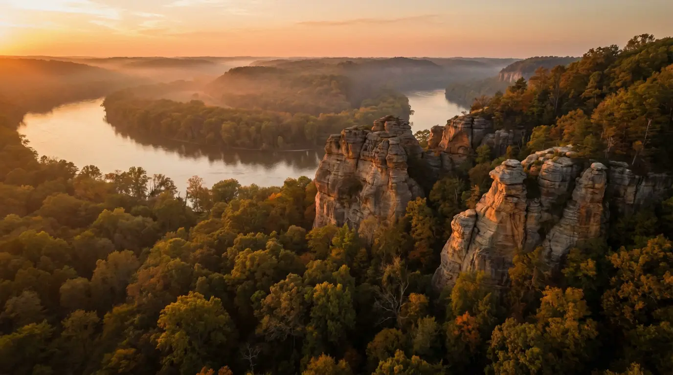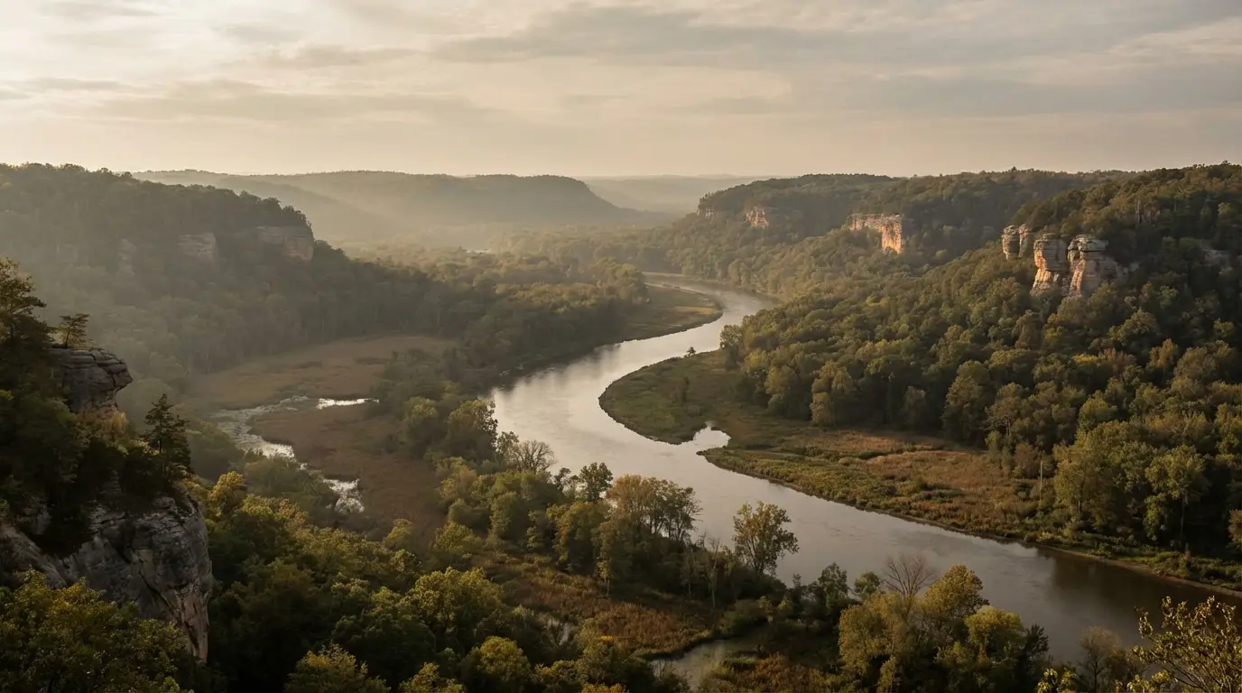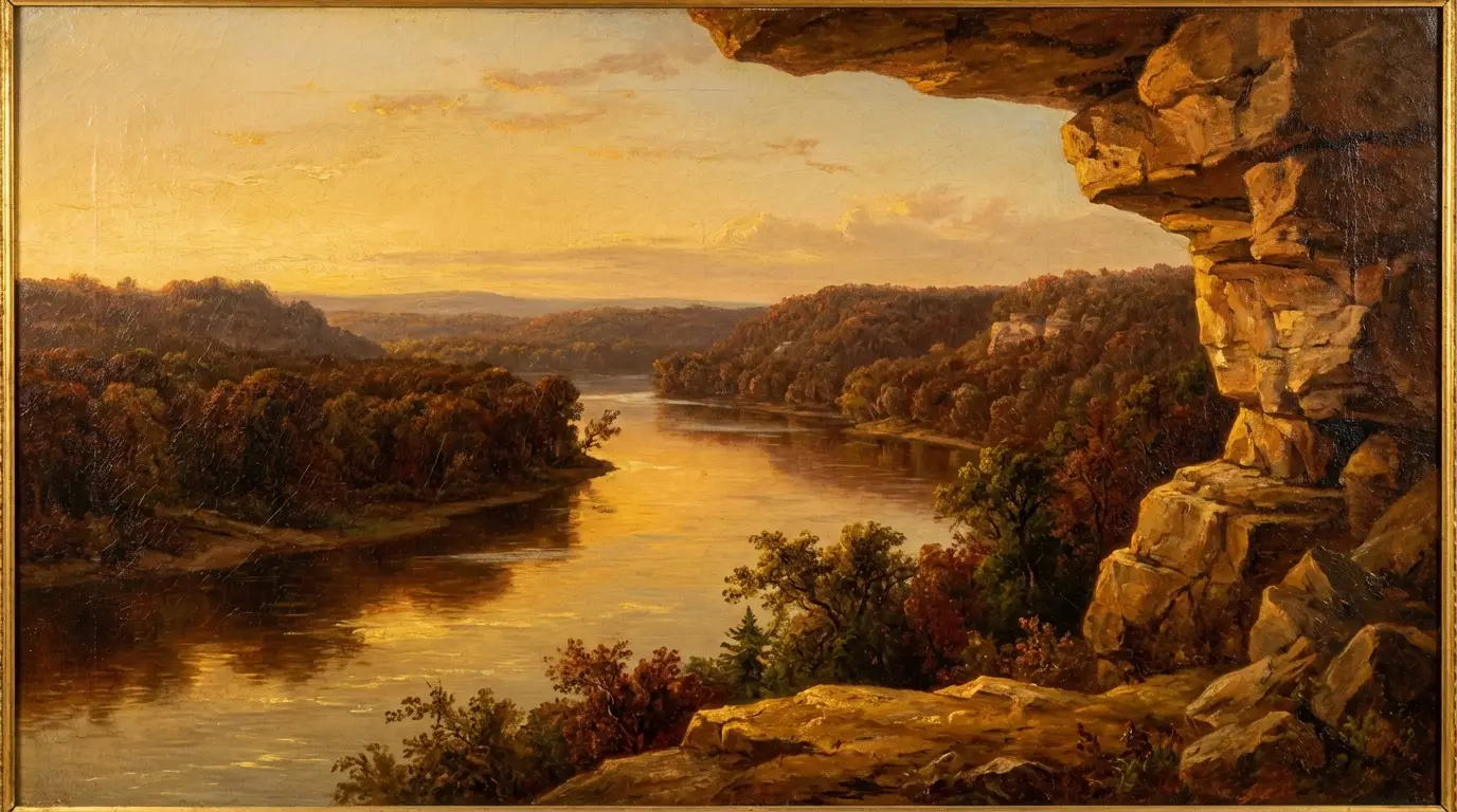 Hudson River School style. Sandstone bluffs, mist. Good for slow push. ββββ