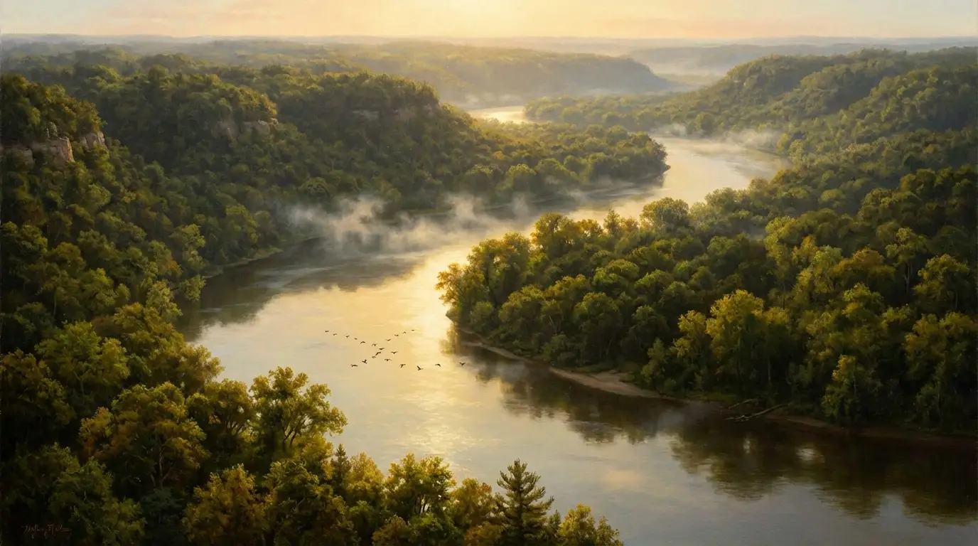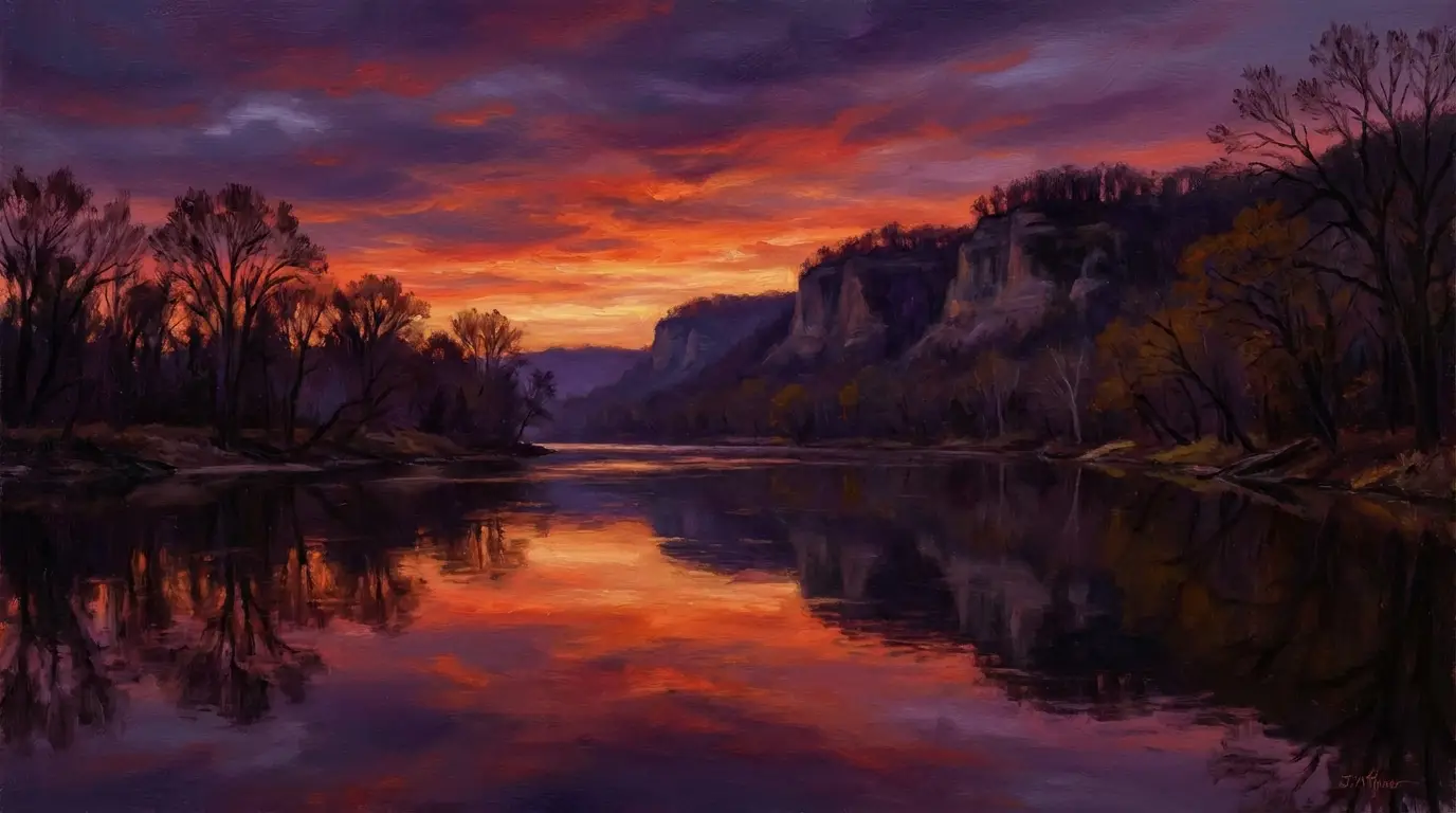 Two options for final shot before cut to black: Illinois River Dusk (purple/orange, melancholy, painterly β see above) vs Illinois River Bluffs Oil Painting (Hudson River School, majestic, timeless β also above). Pick one.