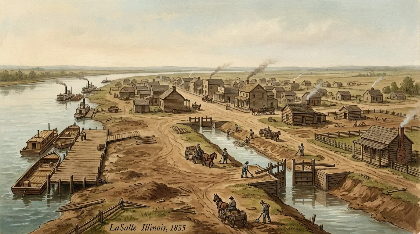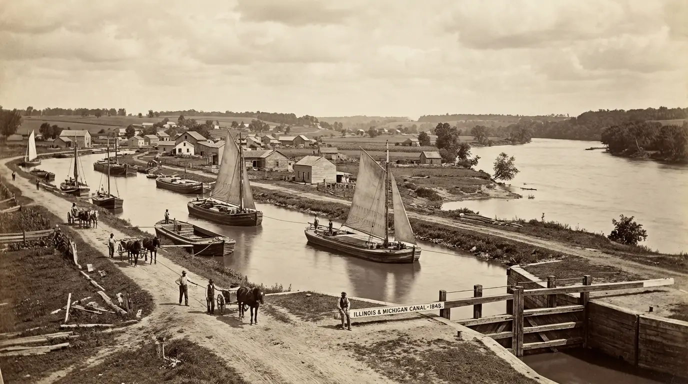 Full canal, boats under sail. "This valley handed Chicago its future."
