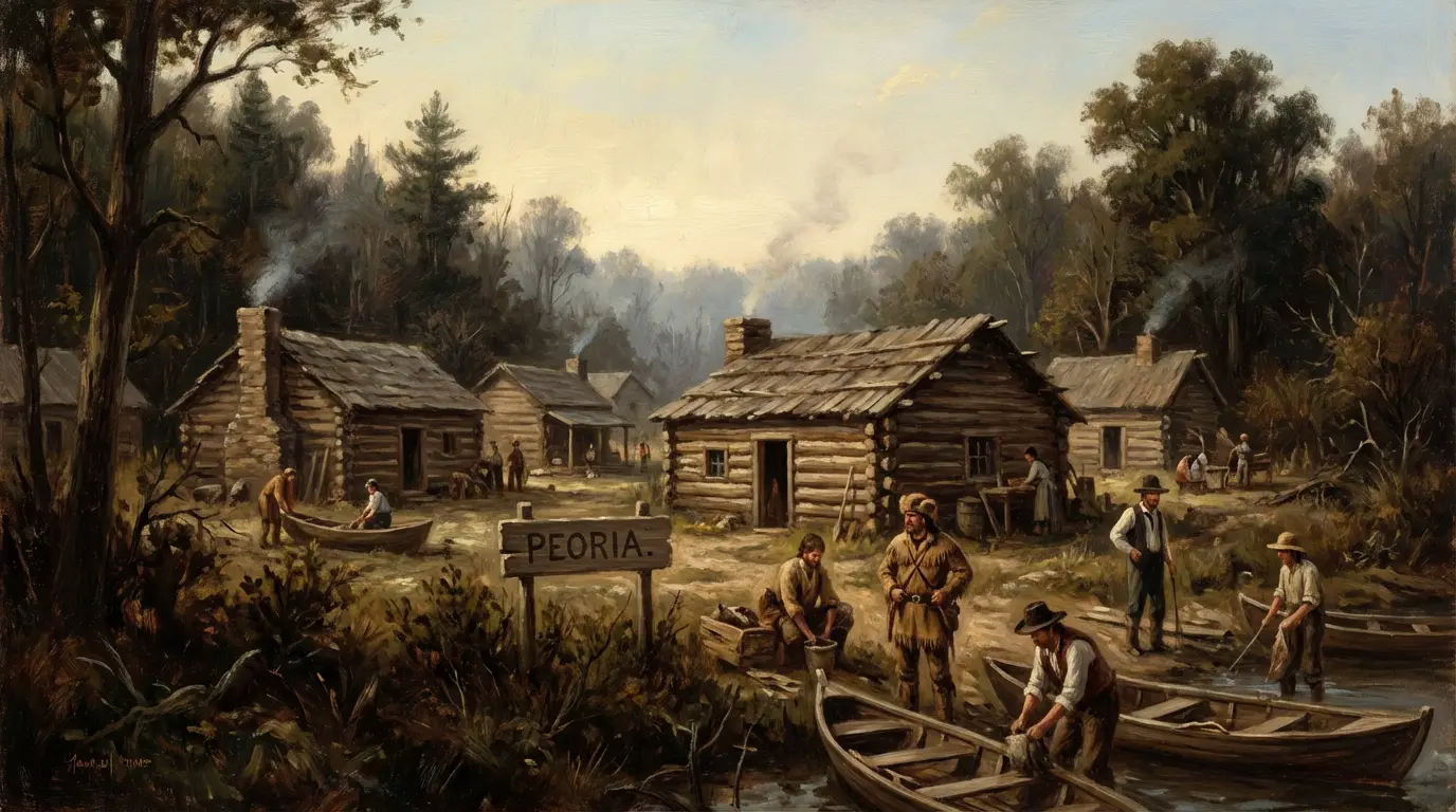 Log cabins on river, rough settlement. "Nearest real town was Peoria." βββββ