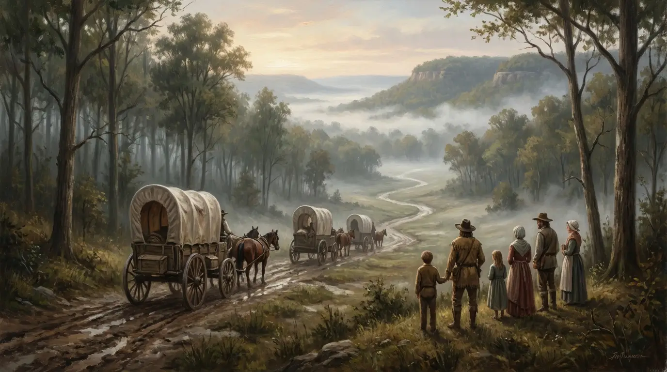 Covered wagons descending into valley. Family watching, mist, rutted trail. ββββ