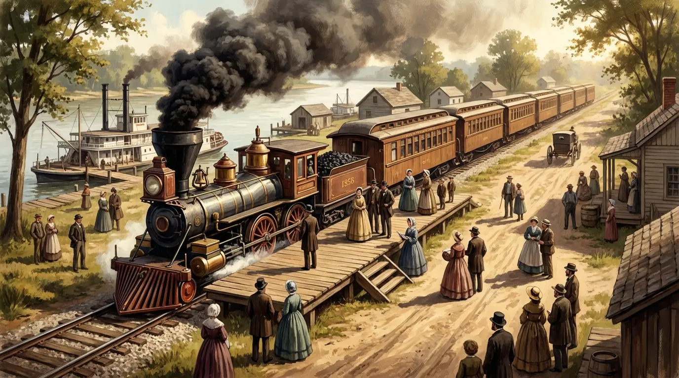 17-car train from Chicago. Steamboat at dock, period platform. βββββ Strong.